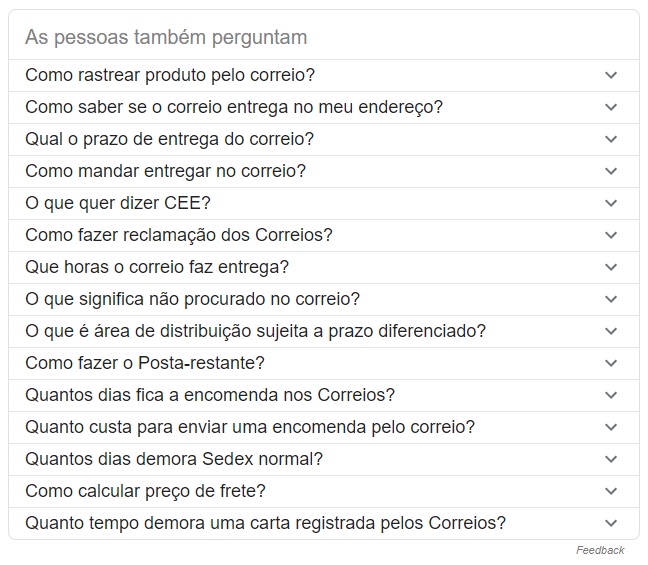 Perguntas relacionadas ao pesquisar por “rastreamento correios”. Fonte: Google.